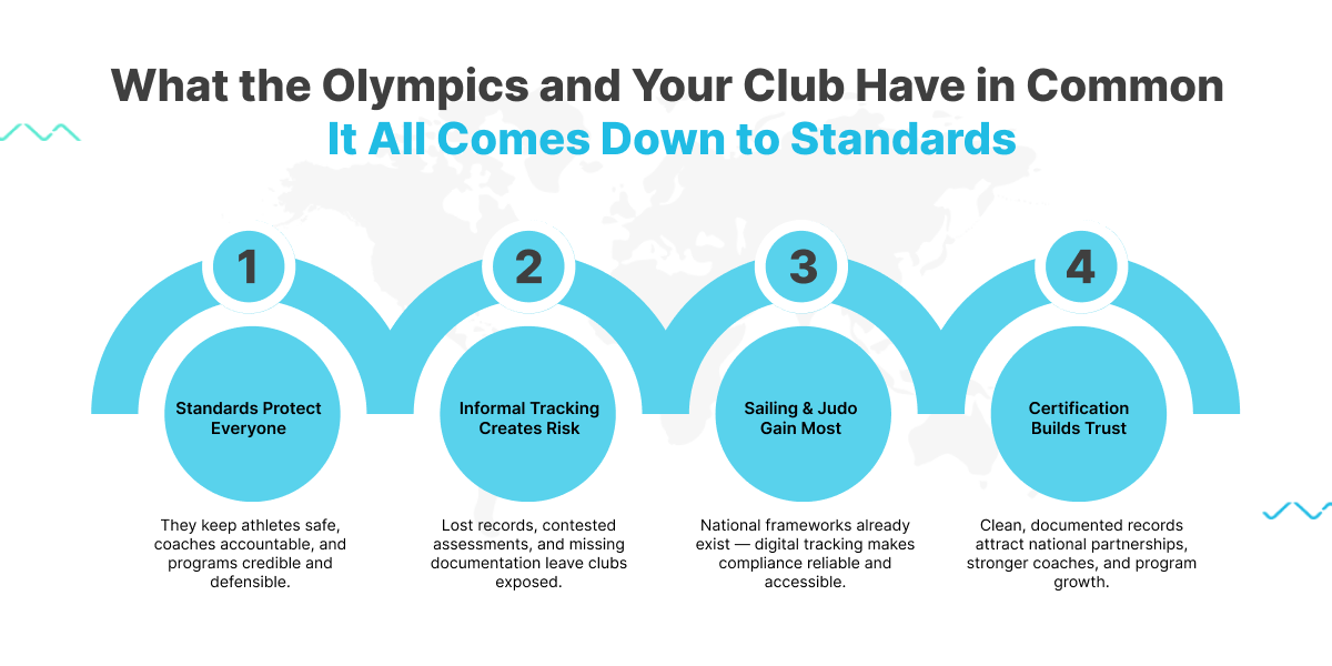 This is exactly the same logic that underpins certification-based sports programs at the club level. Whether a club runs CANSail progressions, judo belt progressions, wrestling skill tiers, or any other structured certification framework, the fundamental mechanism is identical to the Olympic qualifying process. Athletes demonstrate specific competencies. Those competencies are evaluated against defined criteria. And a record is created that confirms the athlete has met the standard.